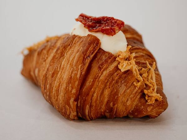 Massa folhada com parmegiano, recheada com provolone e com mussarela derretida por cima.